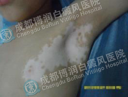 (2013年10月3日初诊时,患者左侧腋下片状白斑明显,边缘模糊,处于进展期)