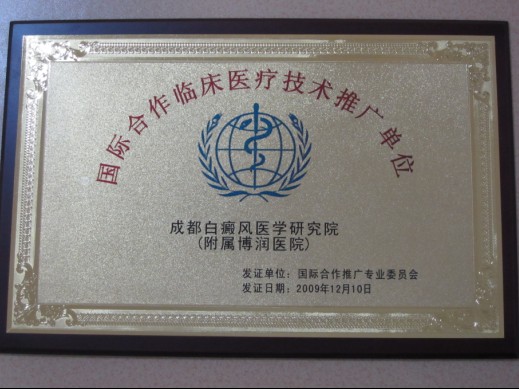 多年来,成都白癜风医学研究院附属医院始终坚持以白癜风医疗的学科优势为依托,在国内外举办各种大中型的白癜风科研交流活动,与包括美国、英国、德国、日本、香港、澳大利亚等国家在内的相关大学、医院、科研机构均建立了长期、稳定的学术交流与医疗合作,每年都会应邀出席国际各大白癜风高峰学术论坛并发表重要科研成果报告。截止目前,我院共派出100余人次的科研人员前往世界各地进行交流、学习,60余人次国外医生学者也受邀来我院访问和工作,被国际合作推广专业委员会授予“国际合作临床医疗技术推广单位”。